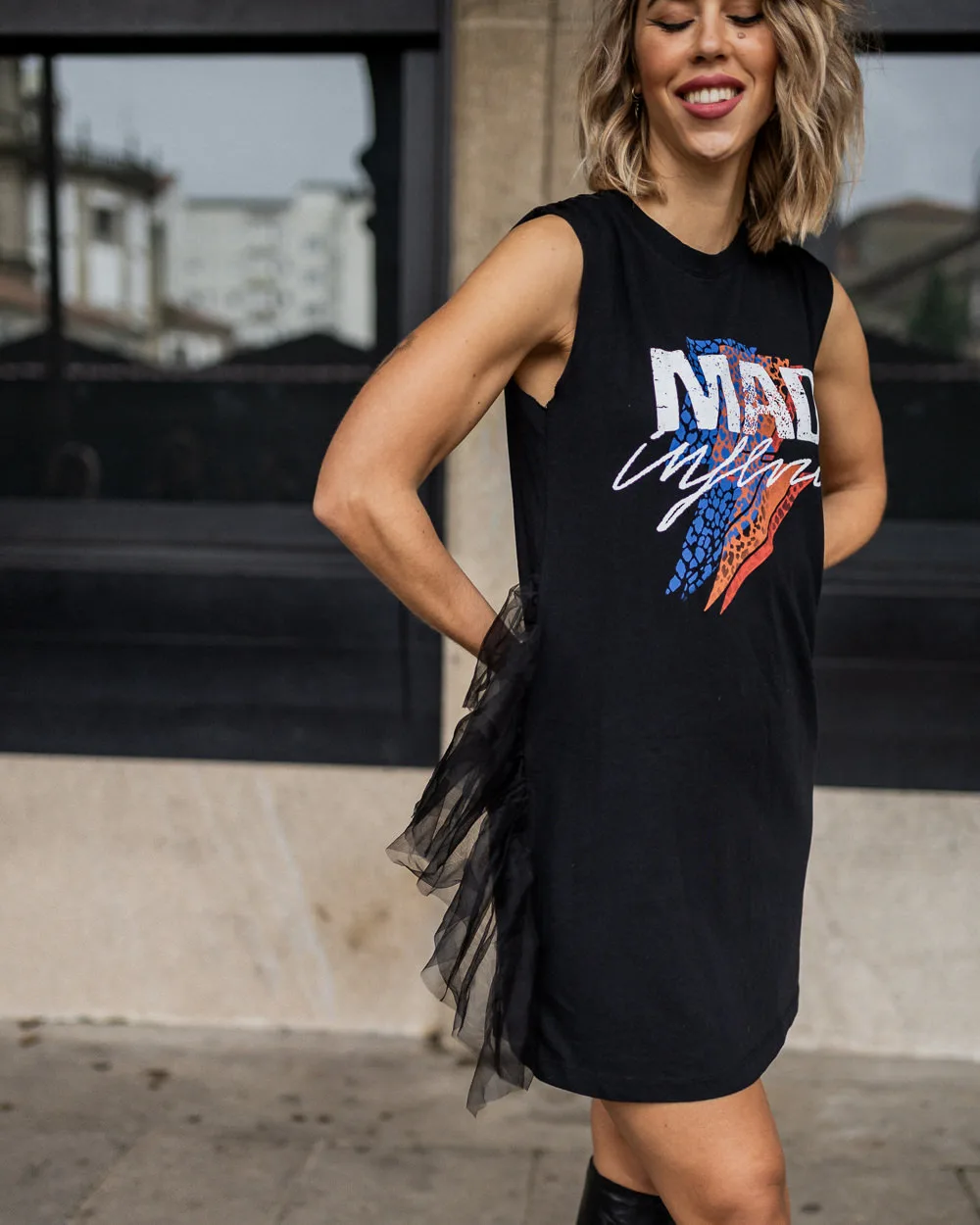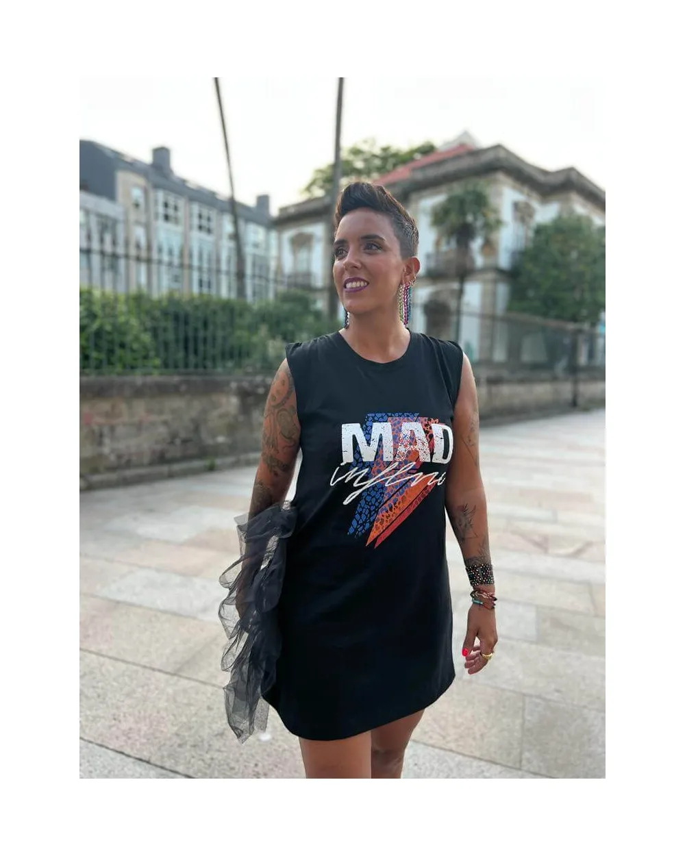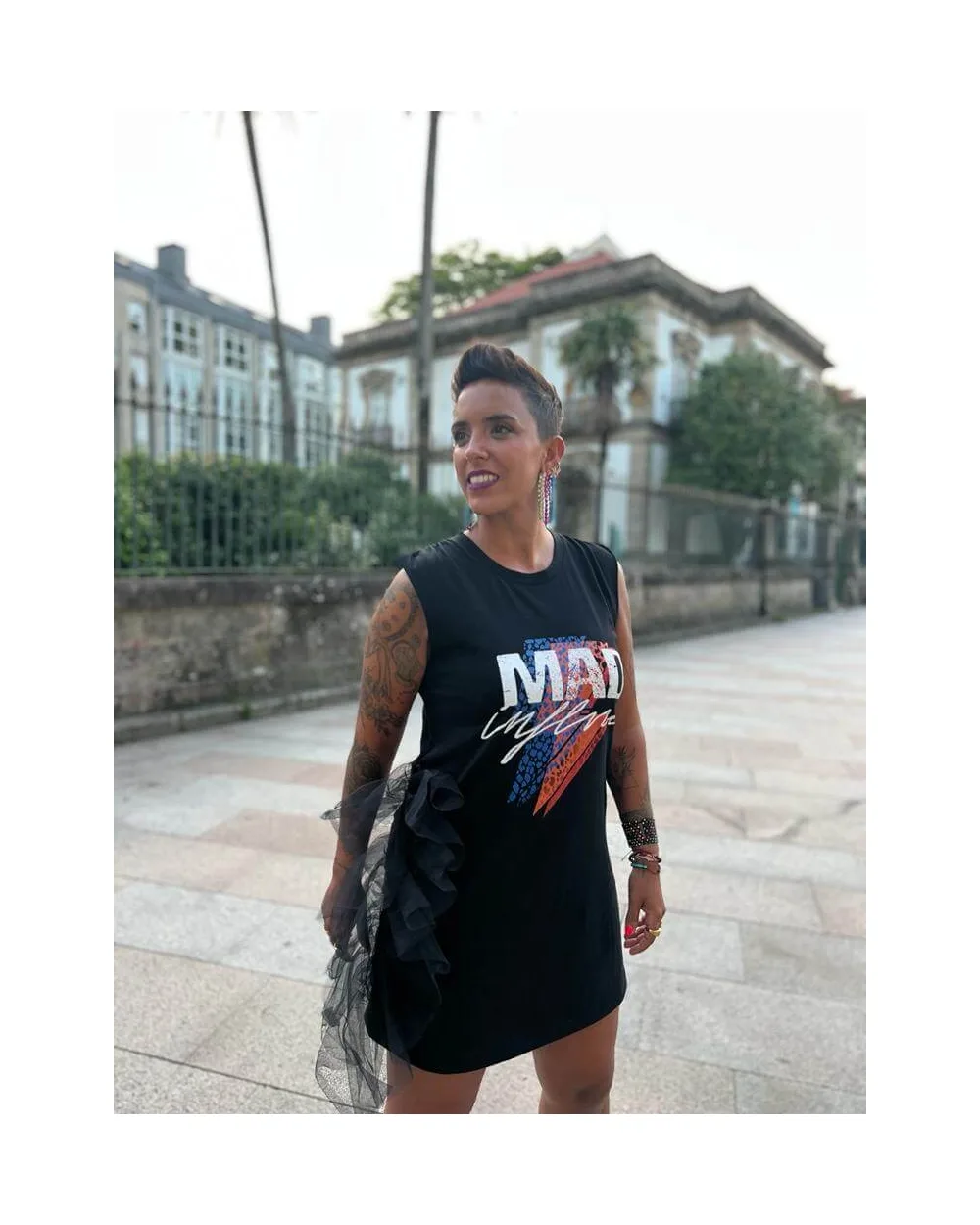 Vestido algodón, detalle ilustración rayo, tul lateral y frunce en los hombros.  100% algodón
